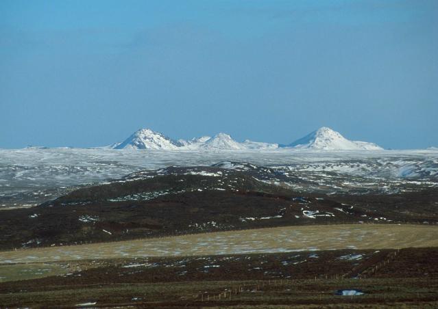 Schneebedekte Vulkane hinter Lavafeldern