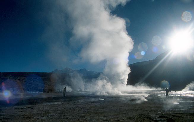 Sonnenaufgang über El Tatio, dem höchstgelegenen Geysirfeld der Welt auf 4150m bei minus 10 Grad